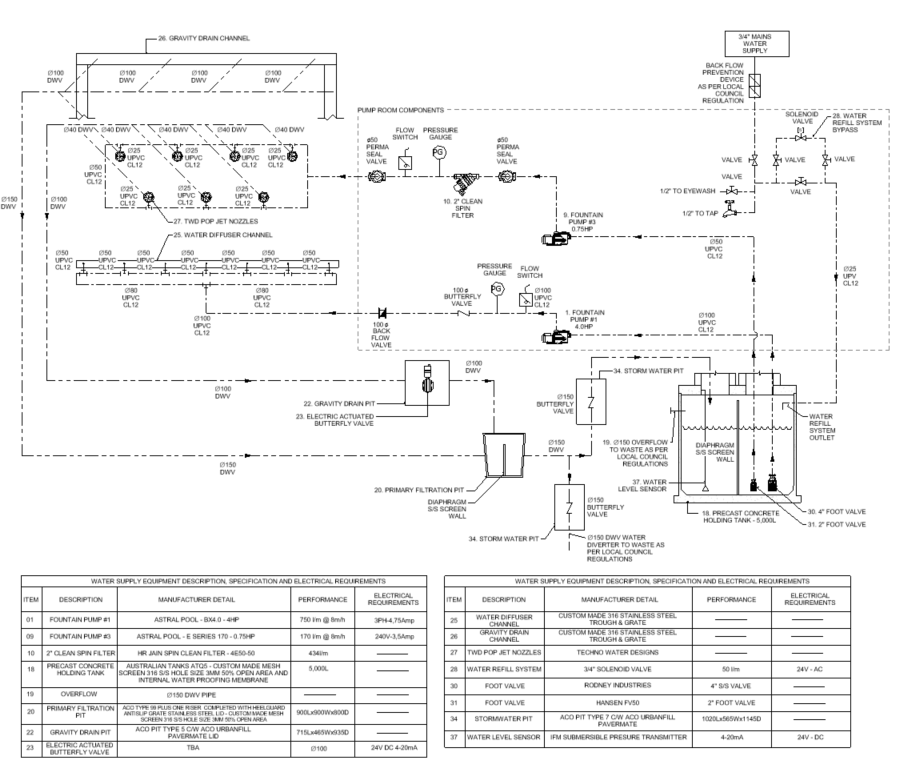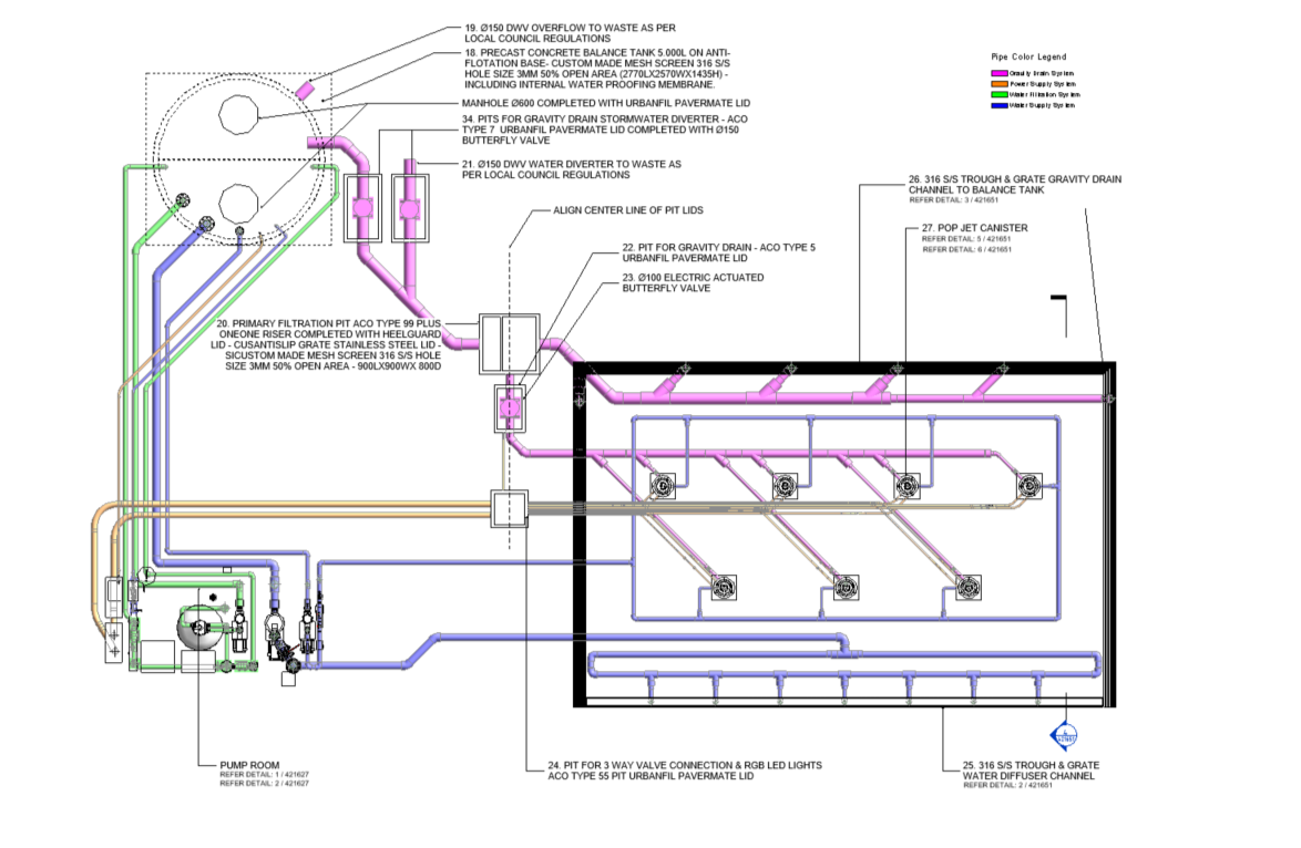 Type of proyect: Interactive water fountain - water carpet effect and water jets